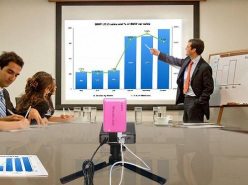第二就是商务市场,高亮的微型投影机也适合小型办公室,三五个人的会议使用微型投影机非常的合适,这个市场需要的产品不仅亮度要高,同时产品也需要便捷的操作方式。多样的连接方式,诸如HDMI接口接口甚至VGA接口以及无线投屏功能,此外专门设计好的商务系统也非常重要,用户可以直接利用U盘读取PPT以及文档文件等等。
