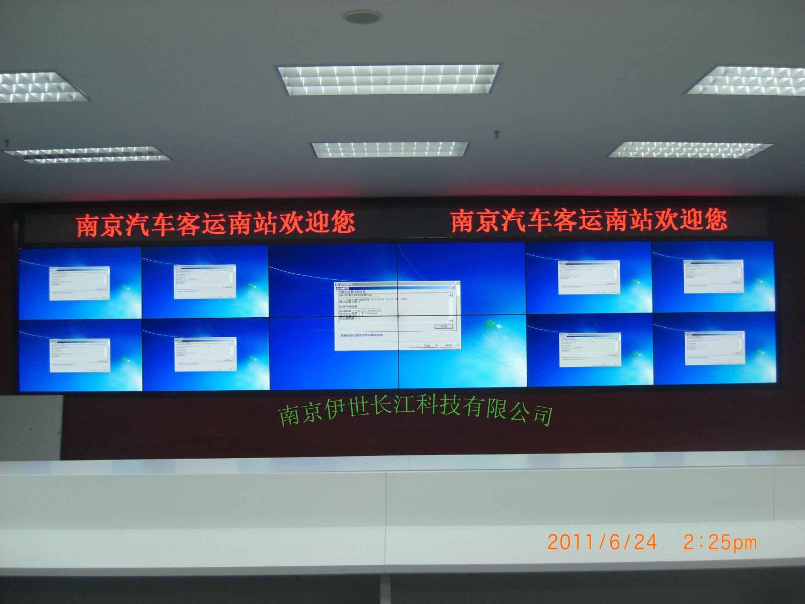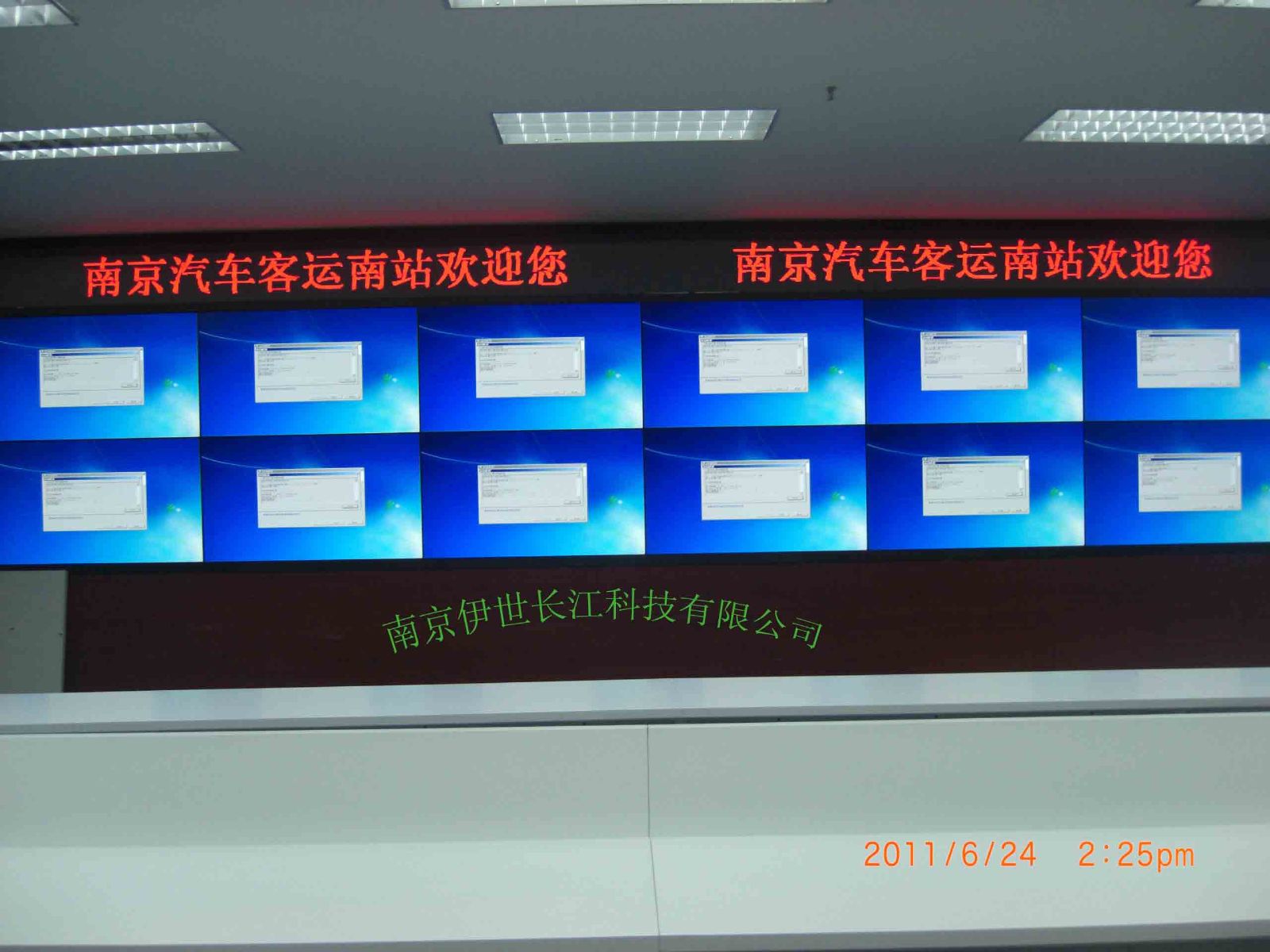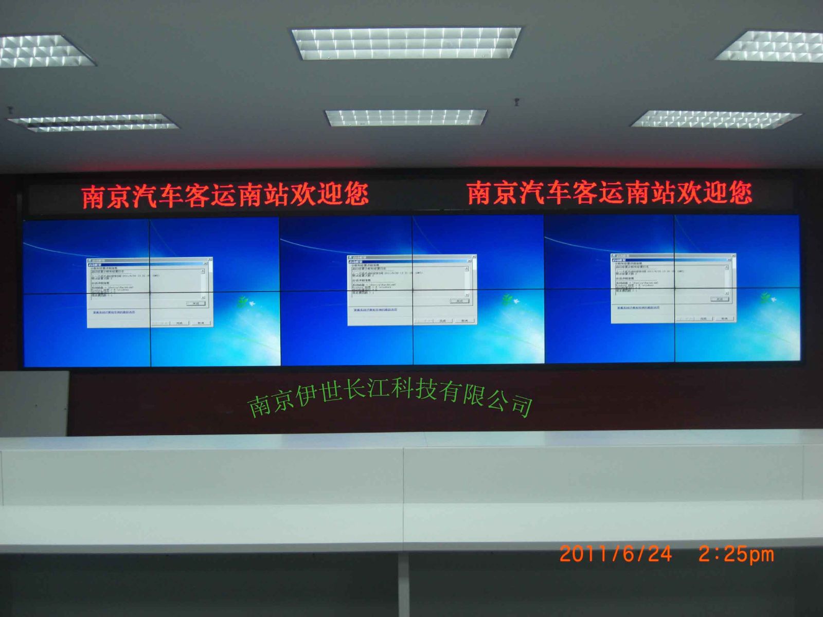 此次工程为南京汽车客运南站安装液晶拼接电视墙,用于保证车站的运营安全以及对车辆的运营进行智能化调度指挥。经过夏普工程师对车站需求的认真分析和对安装环境的实地考察,最终选用了12台夏普(SHARP)的60寸专业液晶拼接显示器PN-V601,组成一组2×6大屏幕液晶拼接电视墙。该显示器采用超薄边框,是专业视屏电视墙的理想选择。边框宽度的降低使得屏幕之间近乎无缝,相邻两台显示器之间的宽度仅为6.5毫米(底边和右边为2.4毫米、顶边和左边为4.1毫米。相邻显示器之间的非画面区域为7.1毫米。PN-V601适用多种信号和组合,配置灵活,屏幕拼接近乎无缝,成为当今视屏电视墙的全新展示标准。